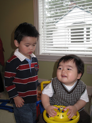 New Party Tricks: nodding his head "yes," doing push-ups (see "resolution" post), signing: bird, book, please, milk, car, daddy, and dog, but not just at his dog, at all dogs - dogs on packaging, dogs on TV, cartoon dogs, dogs in books, you name it, if it has four legs and tail, it's a dog!